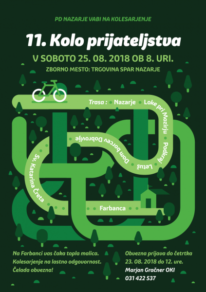 Vabimo vas na tradicionalno 11. kolesarjenje Kolo prijateljstva, ki bo v soboto, 25. avgusta 2018, s pričetkom ob 8. uri pred trgovino Spar v Nazarjah. Obvezna prijava do četrtka, 23. avgusta 2018, do 12. ure na gsm 031 422 537 – Marjan Gračner Oki.